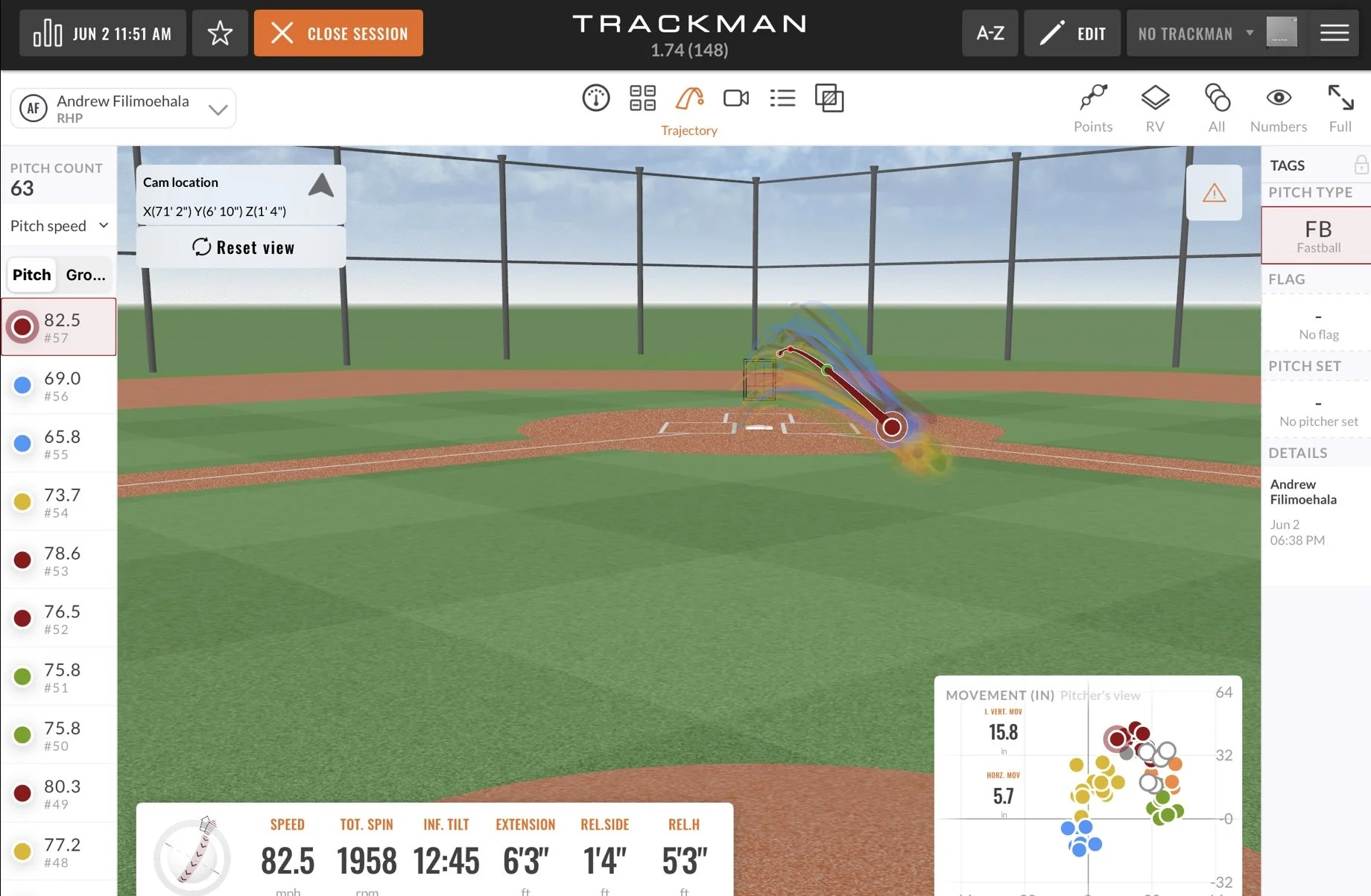 TrackMan is a high-level radar and video system that captures real-time data on pitch velocity, spin rate, movement, release point, and more. Coach Kade uses this to give precise feedback and track progress over time.